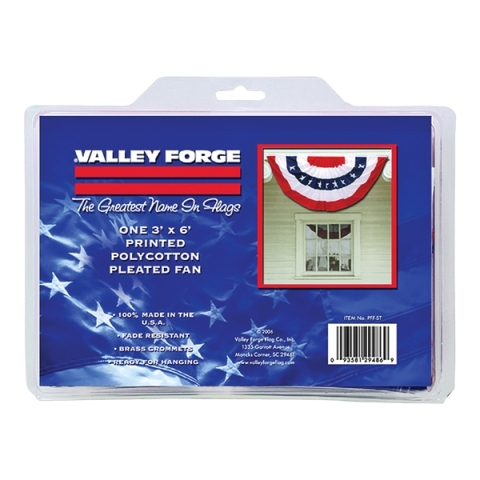 100% made in USA. Ready to hang with fully folded pleats on decks, porches, balconies, fences, outdoors or indoors in meeting rooms. 5 stripes printed in red, white and blue, for fade resistance. Polyester canvas heading with brass grommets for durability.