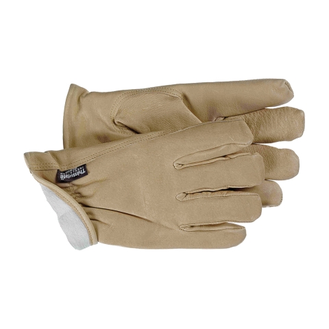Premium grain pigskin lined with thinsulate insulation. Gunn-cut design with keystone thumb, shirred elastic back and self-hemmed open cuff.