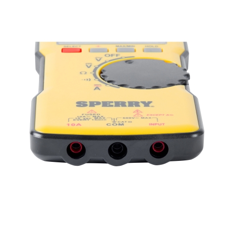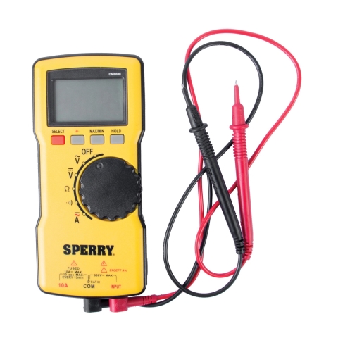 Engineered to exceed the expectations of the professional electrician the Sperry Instruments DM6800 thin digital multimeter offers a durable and ergonomic impact-resistant design manufactured to the latest industry standards. At less than 3/4 in thick, this is the thinnest full sized multimeter yet. Engineered with the ability to test AC/DC voltage, amperage, resistance and continuity. Featuring improved audible and visual indicators and a backlit display. Requires two AAA batteries included in the package and designed with both an auto-off function to save battery life and a low battery indicator to ensure the user does not receive incorrect readings due to a low battery. Unit utilizes auto ranging capabilities that allow the meter to determine the resolution based on the application selected without requiring manual range changes. Capable of testing 600 V AC/DC, this unit also measures AC/DC amps (10 A), resistance (200, 2k, 20k, 200k, 2M, 20M Ohm) and continuity (audible). Durable housing is impact-resistant. CAT III (600 V), cETLus and CE rated with a limited lifetime warranty to give our users the peace of mind they deserve. Ships with soft case, 40 in CAT II/III 600V test leads and two AAA batteries included in the package.