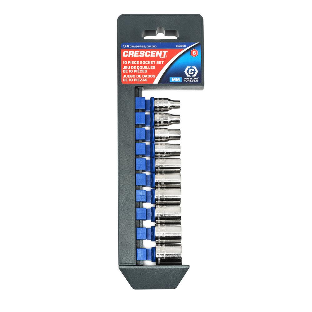 $2.52Description Socket Set, 10 Pc. 1/4 In. Drive 6 Point Metric CRESCENT mechanics tools are made from Crestoloy® alloy steel which is specially formulated and heat-treated for high strength and superior resistance to abrasion and corrosion. Wrenches, ratchets, sockets, and drive tools all have a flawless chrome finish to extend…