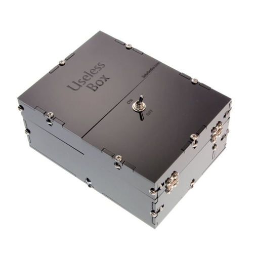 - What’s in the Box: 1 x 39300 Black acrylic “Useless Box” construction set, 1 x Motor set, 1 x Double-pole, double-throw power switch, 1 x Single-pole, double-throw retract limit switch, 1 x 4-conductor ribbon wire, 1 x 2xAA battery pack, 1 x Double-sided sticky tape, 4 x Miniature hinges, 2 x #4 x 1/2″ Motor-mounting screws, 5 x #2-32 x 3/8″ Limit switch / finger mounting screws, 1 x #2 x 1/4″ and #2 Washer set for accessory wheel, 22 x #4 x 3/8″ Bolts and #4 nut sets, 16 x #2 x 1/4″ Hinge-mounting screws, 4 x “Little Rubber Feet” to protect your Useless Box from abrasive counter tops!