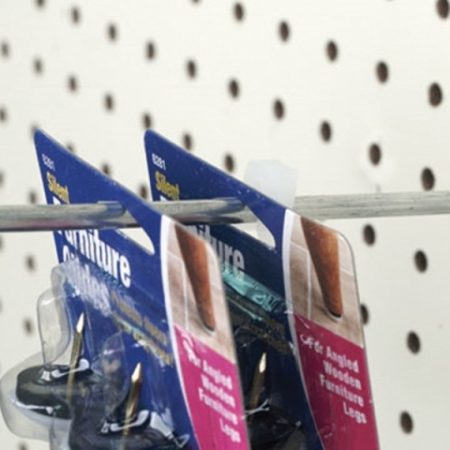 $0.342-piece design for easy installation. Sturdy metal back plate for trouble-free use. Provides solid support without marring display. Works in 1/4 in perforated paneling and slatwall. Reduced gap between wires for better spacing. Notation for compatible wire diameter. Easy load front end allows faster merchandising. Label holder sold separately. 0.212…