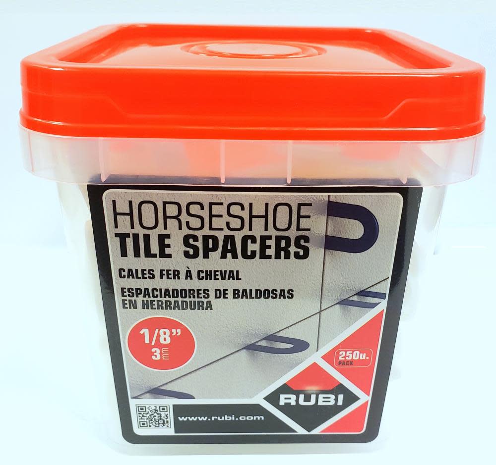 $3.36Description Spacer Horseshoe 1/8 In. (B-250) Rubi 1/8 In. horseshoe tile spacers are a great choice for spacing marble, granite and large tile installations. They are made from injection molded hard plastic and will not compress under heavy loads, making them especially helpful in vertical installation. Use for both horizontal…