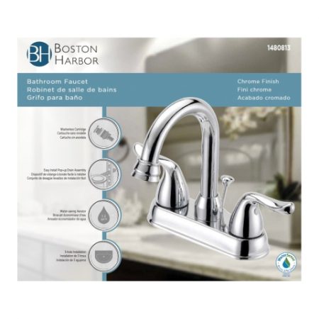 $17.50The Boston Harbor lavatory faucet with plastic pop-up is constructed from durable metal with chrome finish. It has a metal lever handle, hybrid waterway, stainless steel ball valve, 1/2-14 NPSM inlet, 4 in centers, IAMPO and NSF certified and max 1.2 gpm at 60 psi. Connection Size : 1/2-14 Connection…